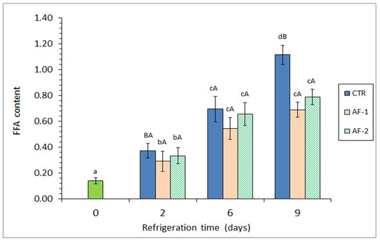 Lipid hydrolysis was assessed via the FFA value (Figure 3). The formation of this catabolic end product significantly increased (p < 0.05) over the storage period across all batches. An inhibitory effect (p < 0.05) on FFA formation was noted at the end of the storage period in the fish samples, where the alga flour extract was included in the packaging medium. However, no significant differences (p > 0.05) were detected between batches containing the alga flour.