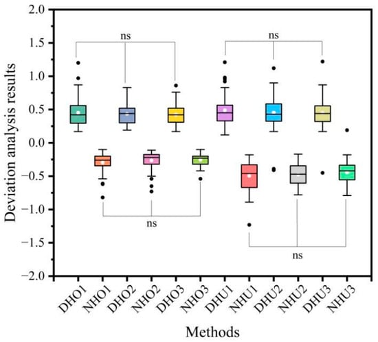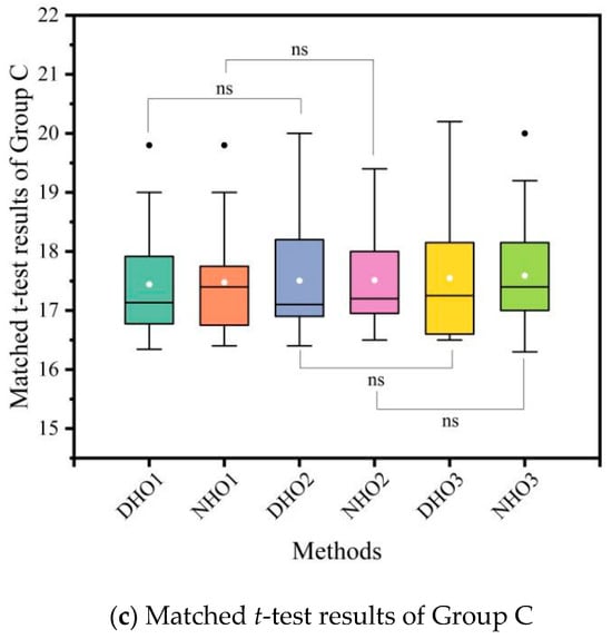 The stability analysis results for Groups A, B, and C are shown in Table 2 and Figure 4. In this analysis, “Dominant Hand Over Non-dominant Hand” is abbreviated as DHO, “Dominant Hand Under Non-dominant Hand” as DHU, “Non-dominant Hand Over Dominant Hand” as NHO, and “Non-dominant Hand Under Dominant Hand” as NHU. Furthermore, the first, second, and third measurements with the dominant hand on top are denoted as DHO1, DHO2, and DHO3, respectively, while the first, second, and third measurements with the non-dominant hand on top are denoted as NHO1, NHO2, and NHO3.