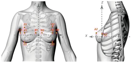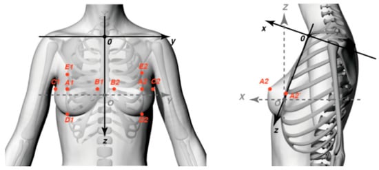 In addition to the measurement starting points, a data recording framework is required to provide the initial measurement reference to help accumulate measurement data. The human body is a 3D structure with directions and anatomical positions, which can be described using a coordinate system [14]. Such coordinate systems can be divided into geodetic coordinate systems and body coordinate systems [15]. In geodetic coordinate systems, the anatomical positions of the human body are measured based on the external reference points and with the surrounding environment as a scale. In contrast, body coordinate systems are defined by human bone landmarks and generally use Cartesian coordinate systems for measurement. Paxino’s body coordinate systems describe the original space of human physical tissues because they are directly imaged and the most similar to the original human form [16]. Between them, the geodetic coordinate systems are the most commonly used in existing breast shape measurements. However, geodetic coordinate systems are not suitable because they often consider the inclined plane of the human skeleton, the vertical plane, during the measurements, which is a simplification of the spatial dimensions of the human body and affects the accuracy of the measurement results [17]. Additionally, to obtain the final measurement values, the obtained data must be converted with its own specific mathematical model. Also, to save computational costs, spatial body dimensions are simplified into planar dimensions, which leads to deviations between measurement results and practical values.