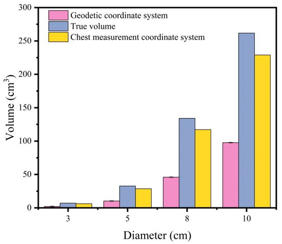 The actual volumes of the hemispheres with diameters of 3 cm, 5 cm, 8 cm, and 10 cm are 7.07 cm3, 32.72 cm3, 134.04 cm3, and 261.80 cm3, respectively. As shown in Figure 8, a comparison reveals that the volumes calculated using the terrestrial coordinate system for hemispheres with diameters of 3 cm, 5 cm, 8 cm, and 10 cm were 2.09 cm3, 10.29 cm3, 45.98 cm3, and 97.72 cm3, with errors of 70.4%, 68.6%, 65.7%, and 62.7%, respectively. In contrast, the volumes calculated using the breast measurement coordinate system were 6.18 cm3, 28.62 cm3, 117.23 cm3, and 228.96 cm3, with errors of 12.6%, 12.5%, 12.5%, and 12.5%, respectively.