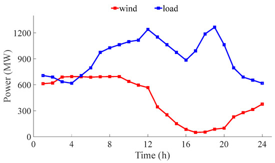 The 24 h power forecast curves of wind power and load in a certain area of the China Southern Power Grid.