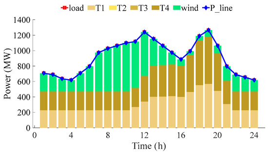 Figure 2 shows that wind power has an evident anti-peaking characteristic, rising when the load falls in 2:00–4:00 and 19:00–24:00, and falling when the load rises in 9:00–12:00. This characteristic can intensify the peak-to-valley difference of the net load curve. Figure 3 demonstrates that T1 undergoes large volatilities, ranging from a minimum of 228 MW to a maximum of 570 MW, and then dropping back to 228 MW. The peak-valley difference of thermal power output in a day is as high as 342 MW. T4 has similar characteristics. While the peak regulation of thermal power satisfies the balance requirements of system, it also subjects the thermal power to significant adjustment pressures, thus affecting its smooth operation.