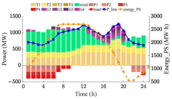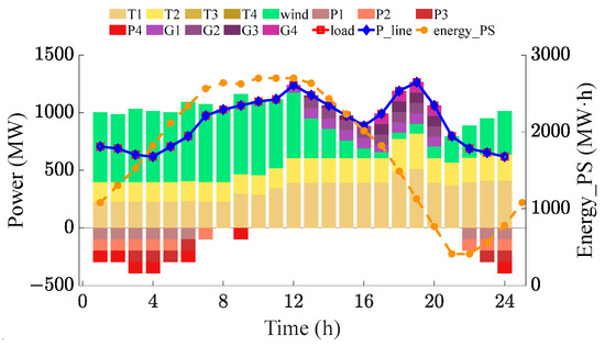 Figure 6 demonstrates that during some specific hours, T-PSUs operate in a simultaneous pumping and generating mode. In the first hour, P4 pumps at 99 MW and G4 generates at 71 MW, so the actual pumped power of PS is 28 MW. This approach accurately matches the actual pumped amount with the surplus wind power to prevent issues related to over-pumping or under-pumping.