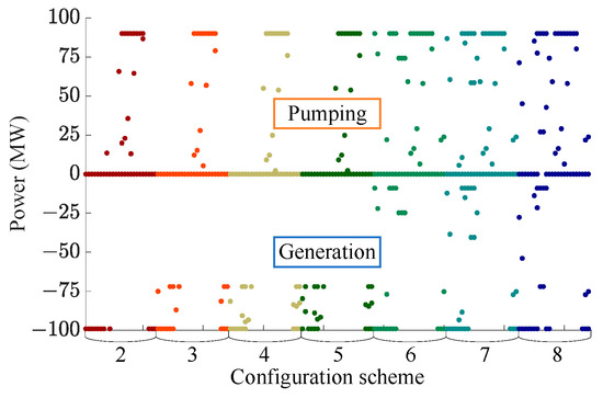 Figure 7 visually compares the pumping and generating outcomes of different pumped storage types in configuration schemes 2 to 8. Among them, each configuration scheme shows the pumping and generating results of all pumped storage units obtained from the 24 h optimal scheduling. It is evident that configuration schemes 6, 7, and 8 (equipped with T-PSUs) offer broad output range in the pump mode, ranging from 0 MW to 99 MW, as T-PSUs can regulate the rotation of the water turbine in the pump mode to adjust pumping capacity extensively. Configuration schemes 2 to 5 (equipped with FS-PSUs or VS-PSUs, without T-PSUs), however, have more limited output distribution due to their technical constraints. Among them, FS-PSUs can only pump at 99 MW, and the VS-PSUs can pump from 72 MW to 99 MW. The dispatching results of the different types of pumped storage in Figure 7 show that the T-PSUs have the widest adjustment range in the pump mode, followed by VS-PSUs, and the narrowest adjustment range is of FS-PSUs. The larger adjustment range also makes it possible for the T-PSUs to achieve the optimal dispatch output.