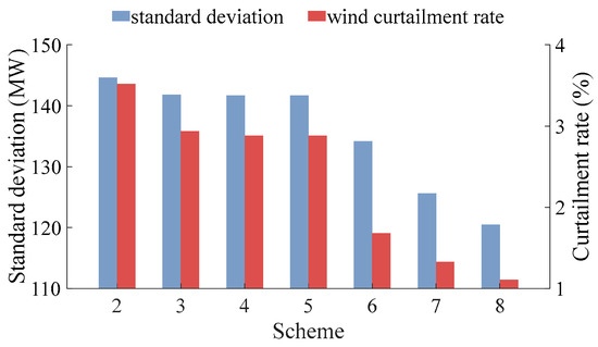 As depicted in Figure 8, the standard deviation of the net load curve in schemes 3 to 5 is lower than that in scheme 2, while schemes 6 to 8 is lower than that in schemes 3 to 5. Among them, the standard deviation of the net load curve decreases from 144.59 MW in scheme 2 to 141.66 MW in scheme 5, and further to 120.49 MW in scheme 8. The correlation between wind power curtailment rates and the standard deviation of the net load curve is evident across pumped storage configuration schemes. Among them, the wind curtailment rate of scheme 8 is the smallest, and the wind curtailment rate of scheme 2 is the largest. This is because the upper-level model optimizes scheduling on the premise of fully utilizing wind power. When the pumped storage has strong regulatory capabilities, the volatility of the net load curve after upper-level optimization is not significant, and thus, the thermal power adjustment in the lower-level model is smoother. In this case, the actual output power of the wind power will be closer to the forecasted power, resulting in a lower wind power curtailment rate.