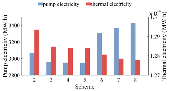 The pump electricity and thermal electricity under different pumped storage configuration schemes.