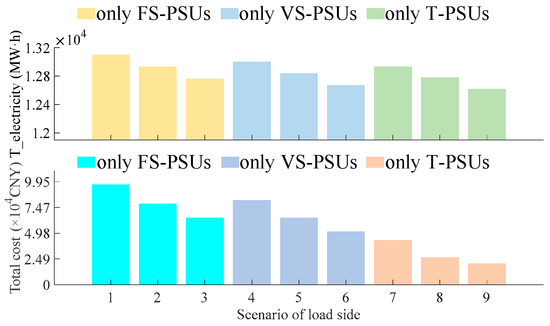 Figure 12 shows the thermal power electricity and total cost for systems respectively equipped with only FS-PSUs, only VS-PSUs, and only T-PSUs under three load rates (0.71, 0.725, and 0.73). It is evident that as the load rate increases, the thermal power electricity trends downward. This is because a higher load rate indicates a smaller peak-to-valley difference in the load curve, resulting in the reduced standard deviation of the net load curve obtained from the upper-level optimization. As analyzed previously in Figure 8 and Figure 9, a lower standard deviation of the net load curve leads to a lower wind power curtailment rate and decreased thermal power electricity. Similar to the findings in Figure 11, the system equipped with only T-PSUs still exhibits superior robustness in response to load rate variations compared to systems with only FS-PSUs. The systems equipped with only VS-PSUs provide better robustness than the systems equipped with only FS-PSUs. For instance, as the load rate changes from 0.73 to 0.71, the total system cost (×104 CNY) rises from 6.47 to 9.68 with only FS-PSUs, from 5.16 to 8.16 with only VS-PSUs, and from 2.05 to 4.31 with only T-PSUs. This also indicates that a higher flexibility in pumped storage regulation can enhance the robustness of the system to different load rates. Furthermore, regardless of load rates, the system with only T-PSUs consistently exhibits the lowest thermal power electricity and total system cost. This verifies that the models of the T-PSUs established in this paper have consistent performance under different load rates.