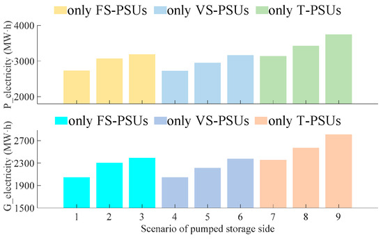 The pump (P_electricity) and generation (G_electricity) electricity under nine scenarios of pumped storage side.