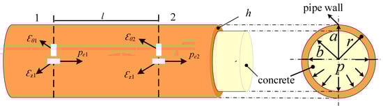 As concrete is pumped, the pressure value gradually decreases along the conveying direction. A conveying distance of length l is selected, with axial and annular strain gauges arranged at overflow sections 1 and 2, respectively, as shown in Figure 1. The measured values of the axial and annular strains are εθ1, εZ1, εθ2, εZ2, respectively, and the change in annular pressure Δpn in this section is: