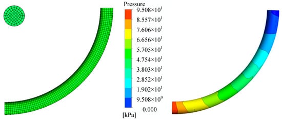 In simulating concrete flow within the pumping pipe, a hexahedral mesh is used; the influence of the number of grids and the sparse distribution of grids on the numerical simulation is considered when performing numerical simulation. Considering the computational accuracy and efficiency, this paper adopts 7270 grid elements and 6460 nodes after checking for mesh independence to carry out the simulation analysis of CFD. The inlet is set with a velocity inlet boundary condition, and the wall is modeled as a no-slip boundary. The outlet section of the bend is atmosphere. The standard κ-ε turbulence model is employed. The fluid simulation time step is 10−4 s, with a convergence accuracy of 10−3. The generation rate of coarse aggregate is determined by the pumping speed and the aggregate particle content. The time step for the discrete element calculation of aggregate movement is 10−6 s, and the total simulation time for the coupling of mortar and particles is 2 s. The numerical simulation is performed using an 11th Gen Intel(R) Core(TM) i7-11700 @ 2.50 GHz processor, and the simulation results are presented in Figure 3. The average pressure difference between the inlet and outlet sections represents the pressure loss in the bend. This simulated pressure loss was compared with the experimental data, as shown in Table 3. The relative errors between the simulated and experimental pressure loss values are less than 10%. The feasibility of using particle flow simulations to model concrete pumping behavior is demonstrated.
