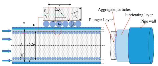 In the pumping pipe, the concrete is divided into a plunger layer and a lubrication layer. In the plunger layer, aggregate particles and mortar move together as a cohesive unit. This results in minimal friction between the particles and the mortar, which corresponds to a lower pressure loss. In the lubrication layer, the mortar flows in layers, experiencing friction between the mortar and the pumping pipe wall, friction due to the relative slip between different mortar layers, and friction from the relative movement between the lubrication layer and the plunger layer. This friction results in significant energy consumption and corresponds to considerable pressure loss during the pumping process. The factors affecting pumping pressure loss include pipe wall roughness, lubrication layer thickness, aggregate particle shape and size, viscosity of the lubrication layer, Reynolds number, and concrete pumping speed. The one-dimensional flow model assumes that the lubrication layer and the critical point of the plunger layer are filled with coarse aggregate particles. Coarse aggregate particles of different shapes are approximated as spherical particles with equivalent sizes, as illustrated in Figure 4, where v represents the average concrete velocity, l is the distance between the selected control body overflow sections 1 and 2, z1 is the height of the axis of overflow section 1 from the reference datum, z2 is the height of the axis of overflow section 2 from the reference datum, p1 is the average pressure at overflow section 1, p2 is the average pressure at overflow section 2, d is the inner diameter of the pumping pipeline, δ is the thickness of the lubrication layer, K is the equivalent particle size of the coarse aggregate particles, and τ0 is the viscous force between the lubrication layer and the plunger layer.