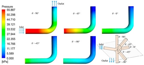 According to the particle flow numerical simulation process, with a concrete pumping pipeline diameter of 125 mm, the combined effects of centrifugal force, particle collisions, and collisions with the pipe wall create blocking effects at the elbow. To better simulate the concrete flow, an adjustment section is added: a 500 mm straight pipe section is placed before the elbow, and a 400 mm straight pipe section is added after the elbow. The concrete model and aggregate particle shape remain consistent with the validation model, with a radius of curvature of 195 mm and a pumping speed of 0.905 m/s. The inlet axis is parallel to the horizontal plane, and the outlet axis is at an angle to the horizontal plane. The pumping pipes are arranged at angles of 90°, 45°, 0°, −45°, and −90° relative to the horizontal direction. The bend model is meshed using hexahedral elements, totaling 5470 elements and 5092 nodes. The simulation duration is 2 s, with a fluid simulation time step of 0.0001 s and a particle simulation time step of 0.000001 s. The interaction forces between the fluid and the particles are calculated using a coupled drag force model. After the numerical simulation of particle flow, the pressure distribution in the pumping pipeline is as illustrated in Figure 6. The figure shows that the pressure at the pipeline inlet increases with the horizontal inclination angle. When the inclination angle is perpendicular to the ground, the pressure loss during concrete pumping is highest. This is because, in addition to overcoming resistance along the pipeline, the concrete must also overcome the flow resistance generated by its own weight. In other words, as the horizontal inclination of the pipeline increases, the concrete must overcome not only the increased resistance to flow caused by its own weight but also greater flow resistance within the pipe. This leads to higher energy loss.