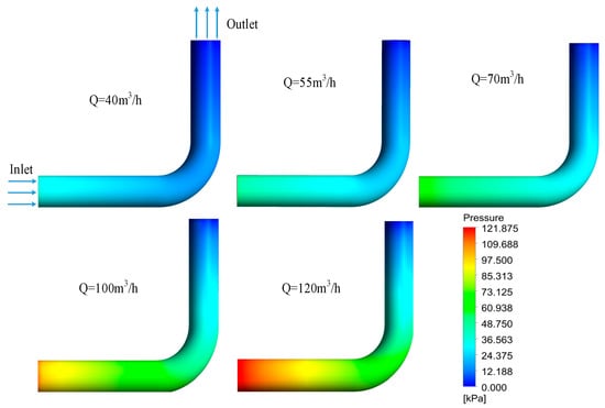 A bend with a curvature radius of 195 mm is used, and the pumping flow rates are 40 m3/h, 55 m3/h, 70 m3/h, 100 m3/h, and 120 m3/h. The elbow is positioned at a 90° inclination to the horizontal direction. Numerical simulation analysis of the particle flow is performed using the standard κ-ε turbulence model. The calculation results are shown in Figure 8. The figure shows that as the pumping flow rate increases, the average pressure at the inlet section also rises. This is because a higher flow rate significantly impacts the rheological properties of the concrete. This affects the velocity distribution within the pipeline and, consequently, the pressure distribution.