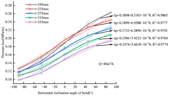 The relationship between the horizontal inclination of the bend and the pressure loss value is shown in Figure 9. For a flow rate of 40 m3/h and a bend radius of 195 mm, the pressure loss increases with a larger horizontal inclination. The correlation between the horizontal inclination angle and the pressure loss is linear, with a goodness-of-fit (R2) value of 0.9865. When the bend radius is 235 mm, 275 mm, 315 mm, or 355 mm, the pressure loss value relative to the horizontal inclination angle remains essentially consistent, following a linear distribution. The R2 values exceed 0.97, indicating a good fit. At the same time, a larger curvature radius of the pumping pipeline results in lower pressure loss during concrete transportation. However, the spacing between each curve changes, indicating an interactive relationship between the pipeline curvature radius and the horizontal inclination angle.