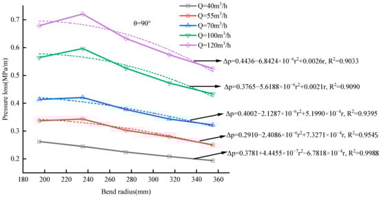 The relationship between the bend radius and concrete pumping pressure loss is illustrated in Figure 10. As the bend radius increases, the pumping pressure loss decreases when the horizontal inclination of the bend is 90° and the flow rate is 40 m3/h. At different flow rates, the relationship between pressure loss and bend radius exhibits similar characteristics. At the same time, as the flow rate increases, the corresponding pressure loss value also increases. Notably, the spacing between the curves changes, indicating a significant interaction between the bend radius and the flow rate.