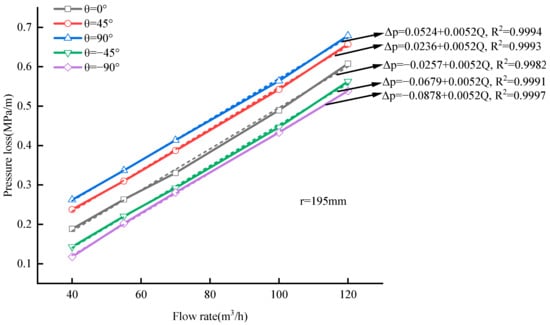 Figure 11 primarily illustrates the pressure loss associated with varying flow rates at different horizontal inclination angles. The figure shows that the flow rate and the concrete pumping pressure loss exhibit a clear linear relationship, with the R2 exceeding 0.99. As the pumping flow rate increases, the pressure loss also rises. This linear trend remains consistent even when the layout of the pumping pipeline changes. Additionally, as the horizontal inclination angle increases, the corresponding pressure loss value also increases accordingly.