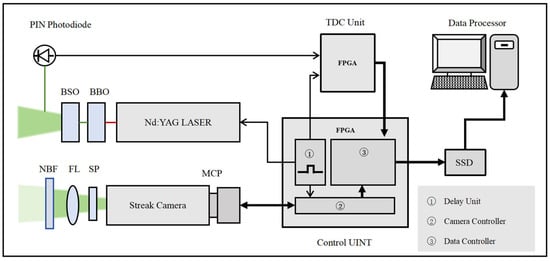 Figure 1 illustrates the configuration of the developed STIL system, which is composed of four primary components: a control unit, a laser emitter, a laser receiver, and a TDC unit. During the detection process, the control unit is pivotal to the system’s operation, orchestrating the generation of trigger signals that activate both the laser and the streak camera, thereby ensuring precise synchronization between the laser pulse emission and the streak camera’s recording. Furthermore, the control unit oversees the streak camera’s timing and image format, guaranteeing that streak images are captured accurately. It also maintains system synchronization and manages the storage of ranging data, which is critical for precise time-of-flight (ToF) measurements and target analysis.