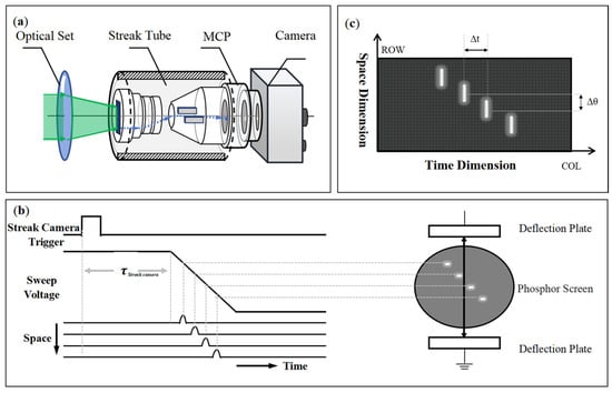 Schematic diagram of the streak camera imaging principle: (a) composition of the streak camera; (b) after triggering, the signal is deflected and imaged on the phosphor screen; (c) output of the 2D streak image.