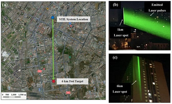 In the ground tests, the STIL system emitted laser pulses horizontally from a window at an elevation of approximately 40 m within the building, aiming at the surface of the target building. The locations of the STIL system and the target building, which is 6 km away, are shown in Figure 3a. Figure 3b illustrates that the STIL system’s laser pulse forms an elliptical Gaussian spot on a building target 1 km away, with the large-angle detection laser reflecting off the unobstructed target to generate a fully reflected echo spot.