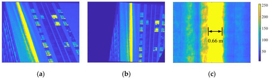 Before conducting the STIL ranging assessment, we first carried out a field test to capture laser spot images and analyze the far-field characteristics of the laser spot. A high-resolution CCD camera was used, with an exposure time of 500 ms, to obtain 2048 × 2592 pixel 8-bit grayscale images of the laser spot on the target surface. Figure 4a shows the raw image of the laser spot. Due to the limited camera angle during the test, the laser spot images exhibited distortion and aberration, making it challenging to directly derive its intensity distribution. To address this issue, a projection correction is applied to the image coordinates, aligning the optical axis of the rectangular spot with the image coordinate axis. This transformation enables the extraction of the intensity distribution along the scanning direction by reading the pixel grayscale values from a single row of the image.