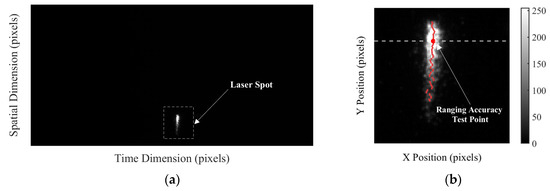 Streak images captured by the STIL system: (a) raw streak image (512 × 1024 pixels) of the target in 6 km; (b) ROI (100 × 100 pixels) of the laser spot: the dashed line indicates the row of the ROI used for range accuracy verification, with red dots marking the centroid feature point extracted.