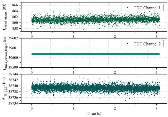 The time measured by TDC are shown in Figure 6. TDC channel 1 specifically measured the optical trigger time , resulting in an average value of 861.1 ns, with a standard deviation of 0.70 ns. This indicates optical trigger signal has a time jitter of σ1 = 0.70 ns; TDC channel 2 measured the streak camera trigger time , yielding an average value of 39,600.4 ns with a measurement accuracy of σ2 = 48 ps. This high precision at the picosecond level demonstrates that the TDC is capable of achieving high-precision time measurements for pulse signals. Additionally, the measurement accuracy of 48 ps further underscores the control unit’s capability to generate accurate trigger pulses, which is essential for the STIL system. This precision and stability are particularly crucial in future dynamic scanning measurement applications, ensuring more reliable detection performance.