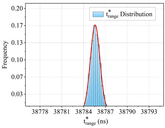 Combining the TDC measurement data and the centroid temporal data obtained by streak image processing, we made the comprehensive evaluation of the system ranging accuracy. The data are shown in Table 2. The normalized histogram of 6000 measurement results is shown in Figure 7. Based on the normalized histogram, the system’s average ranging time is 38,785.6 ns, corresponding to a relative distance value of 5817 m. The red solid line represents the Gaussian fit applied to the histogram data. According to the fitting results, the distribution of the system’s measurement time follows a normal error distribution, and the fitting yields a standard deviation of = 0.65 ns. Clearly, this value is smaller than the standard deviation of the TDC measurement time and the streak echo time. This can be attributed to the TDC capturing the time jitter of the optical trigger signal, which has a significant impact on precision in long-distance measurements. This result indicated that the ranging accuracy in the ranging measurements is 0.65 ns. The results in Figure 7 verify the stability and high precision of the system’s ranging error performance.