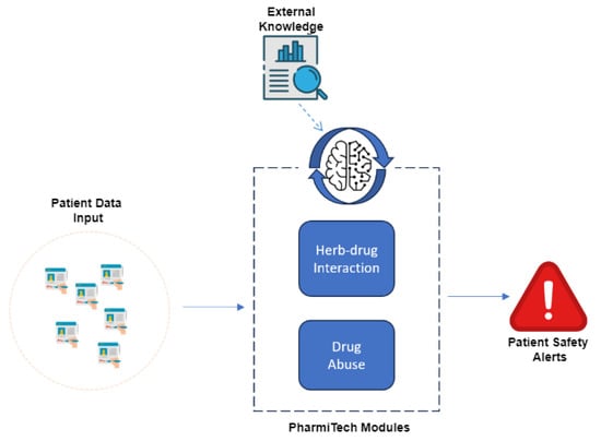 This tool was designed in a modular architecture, and currently integrates two modules that perform the detection of HDIs and drug abuse in real-time. It provides relevant and informative alerts to pharmacists so they can better assist different patient populations, based on the information requested by the system and provided by the pharmacist. PharmiTech is designed to dynamically learn from new data inputs, ensuring adaptability and continued improvement. Furthermore, a context-aware detection is performed when there is information of the previous purchases of each patient, while always ensuring privacy and confidentiality. The generated alerts are displayed in a simple and user-friendly graphical interface, which ensures that the most relevant information for each patient is provided to a pharmacist before a purchase is completed. The two modules are described below.