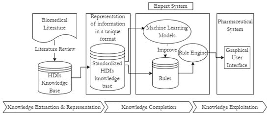 The module was developed with three phases, each introducing distinct components and challenges. In the initial phase, Knowledge Extraction and Representation, data concerning HDIs is extracted from literature and structured in a knowledge base. Moving on to the second phase, Knowledge Completion, the extracted information undergoes standardization to facilitate seamless integration into the expert system. Lastly, the concluding phase, Knowledge Exploitation, uses the knowledge from the preceding phases to intelligently provide pharmacists with valuable and timely information regarding potential HDIs. This implementation was described in [26] and is summarized in Figure 2.
