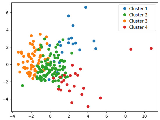 By applying the well-established K-Means machine learning algorithm [30] to this improved dataset, the patients could effectively be divided into four clusters, with just a small overlap between them. These clusters achieved a Silhouette Coefficient of 0.82, which is reasonably close to the maximum value of 1. Figure 3 provides a two dimensional representation of the purchase behaviour of the 200 patients, obtained through Principal Component Analysis (PCA) [31] after the clusters were computed.