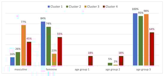 Figure 4 provides an overview of the demographic information of each cluster, with percentages for male and female patients, as well as percentages of each age group, which correspond to under 18 years old, between 18 and 65, or over 65, respectively.
