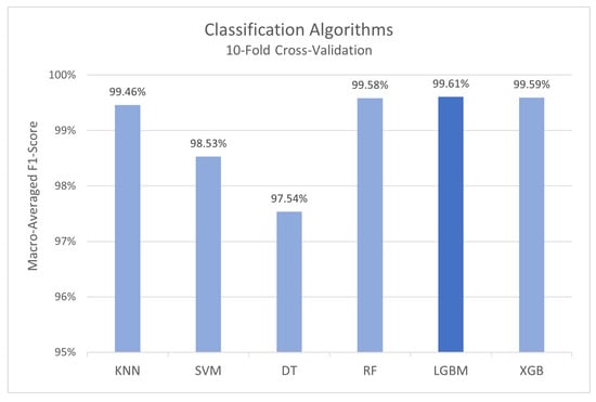 To ensure that the most suitable machine learning models were selected for deployment in the DSS, a standard performance evaluation was conducted with multiple supervised classification models. A 10-fold cross-validation was performed with the utilized dataset of 200 patients for several algorithms, including K-Nearest Neighbours (KNN), Support Vector Machine (SVM), Decision Tree (DT), Random Forest (RF), Extreme Gradient Boosting (XGB), and Light Gradient Boosting Machine (LGBM). The latter achieved the highest macro-averaged f1-score in the experiments, a value of 99.61%, so it can be reliably used to determine the cluster to which a patient belongs to, while remaining lightweight and computationally efficient. The results of the analyzed machine learning models are summarized in Figure 5.