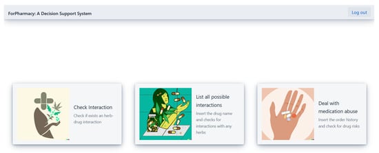 In this case study, Mrs. Ana is a 66-year-old female diagnosed with atrial fibrillation. She visits the pharmacy to purchase the prescribed medicine, specifically warfarin. As a precautionary measure, the pharmacist uses the PharmiTech tool to identify any potential interactions between warfarin and herbs, filtering them to provide Mrs. Ana with relevant information related to her pathologies. Upon logging into the system, the pharmacist is presented with three options on the main interface, as showcased in Figure 6. This main page is crucial for guiding the pharmacist through the system’s functionalities in a user-friendly manner. By offering clear choices, it ensures that the pharmacist can quickly access the specific tool needed to check for HDIs, and analyze drug abuse risk.