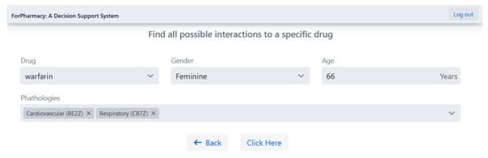 The pharmacist selects the “List all possible interactions” option to investigate any potential HDI. When using this option, it is important to provide the name of the drug to be analyzed, along with relevant patient information such as age, gender, and any associated medical conditions. Considering this use case, the patient has 66 years old, female, and suffers from both atrial fibrillation and asthma. Thus, the pharmacist enters this information in the system. Under the pathologies section, he needs to select “Cardiovascular” and “Respiratory” options, as demonstrated in Figure 7.