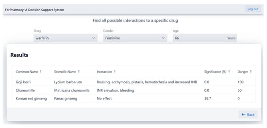 Upon clicking the “Click here” option, a pop-window with a table is displayed, presenting a list of herbs that interact with the drug warfarin. The table provides essential information to the pharmacist, including the scientific and common names of the herbs, the clinical outcome resulting from the interaction, the significance value, and the level of interaction. Figure 8 provides a visual representation of this information available to the pharmacist. The system has detected three different HDIs. These interactions involve the herbs Goji berry, Chamomille, and Korean red ginseng. Simultaneous use of warfarin and Matricaria Chamomilla herb is linked to a 50% hazard percentage, indicating a moderate level of interaction. This interaction may lead to potential adverse effects like elevated International Normalised Ratio (INR) levels and an increased risk of bleeding. The INR blood test gauges an individual’s blood coagulation rate. When an individual’s INR test result surpasses their designated target range, it signifies that their blood is coagulating at a slower pace, heightening the likelihood of bleeding [32,33,34].