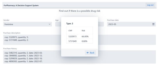 As a precautionary measure, the pharmacist wanted to check checked if there were any anomalies with the dosages of this purchase, according to the type of patients she belonged to. To accomplish this, the pharmacist clicks on option “Deal with medication abuse”, represented in Figure 6, and inserts the relevant information. This information, represented in Figure 9, includes the historical context-ware prediction of the type of patient, considering the dosages of the past purchases that were recorded and safely stored in the pharmacy’s database. Even though these past purchases were of different products, their active substances were also paracetamol or simvastatin, so they were automatically included in the context to improve the reliability of the prediction. The patient’s cardiovascular issues were correctly predicted and the system assigned her to patient type 2, which corresponds to patients with cardiovascular diseases, diabetes, sleep or psychiatric disorders.