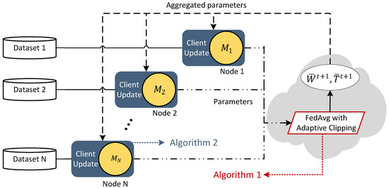At time step t, a model is trained at node k on and optimizes the parameters, which in our case are the weights of the network , where l is the number of layers. is then communicated to the aggregation server. The server receives for N nodes and commences the aggregation process. As a common standard, the server can zero out abnormally large values with a threshold to eliminate the effect of potential data poisoning attacks. Assuming that indicates the j-th element of , then , :
