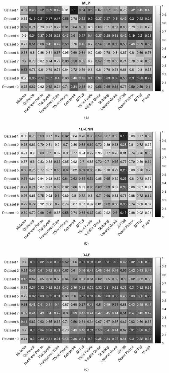 Figure 3 shows the obtained results using a heatmap for each algorithm. The datasets used for training the model in each experiment are indicated on the vertical axis, whereas the APT classes are specified along the horizontal axis. The color spectrum on the right side of each box indicates the range of colors used to differentiate between smaller and larger values. Figure 3a illustrates that the MLP was not able to detect APT classes with acceptable accuracy when trained on a subset of data with only a few APT classes included. Given that the majority of samples were non-APT malware, the model exhibited better performance in detecting malware. Among the datasets used for training, datasets six to eight resulted in better overall performance across all classes. Comparing the spectrum of colors in Figure 3b with the other panels in this figure, it can be concluded that the 1D CNN generally outperformed the MLP and DAE when trained on partial data. Nevertheless, this model seemed to exhibit poorer performance in detecting samples of the APT28 class than its competitors. Interestingly, the 1D CNN’s performance was more consistent across different experiments and scenarios. On the other hand, the DAE exhibited poorer detection performance than the MLP and 1D CNN, as the color spectrum shown in Figure 3c is generally darker than those in Figure 3a,b. Regardless, the achieved results showed less variance than those of the MLP. Although using a more advanced structure with more hidden layers could probably boost the performance of the MLP, 1D CNN, and DAE, we relied on simple structures to study the effect of using FL on boosting detection performance.