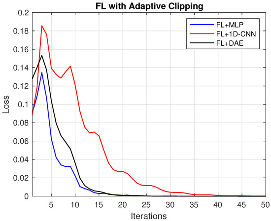Three neural network models—the One-Dimensional Convolutional Neural Network (1D CNN) [44], Denoising Autoencoder (DAE) [45], and Multi-Layer Perceptron (MLP)—were used as the base learners. All models used the Adam optimizer [46]. These techniques and the proposed FL framework were implemented in TensorFlow using Python 3.10.14 The FL framework was executed for 100 training rounds. The learning rate for adaptive clipping was empirically set to . The parameter settings for the local models are reported in Table 2.