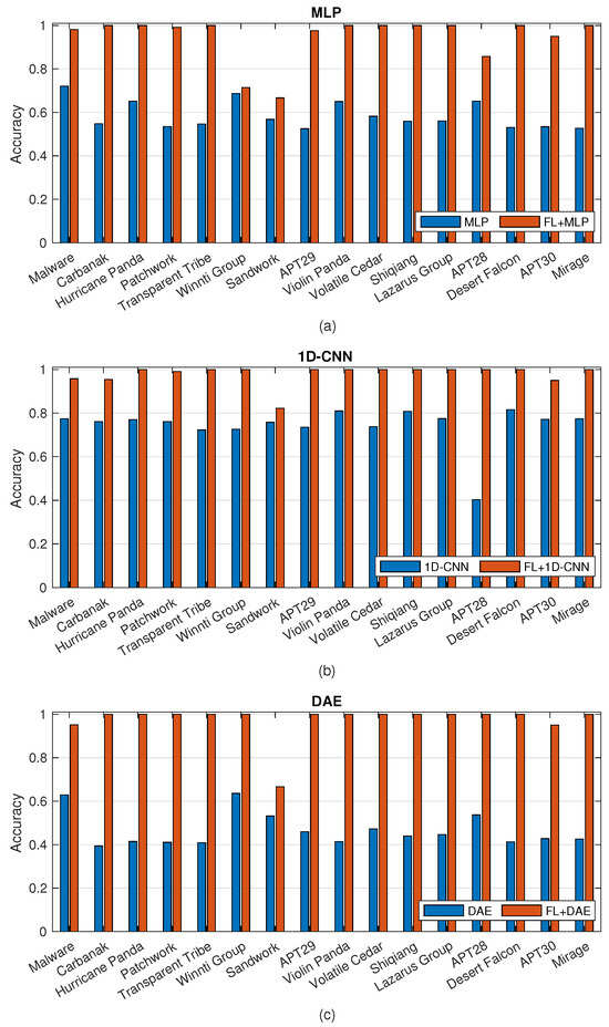 The obtained results shown in Figure 5 indicate a significant improvement in the detection performance of both the APT classes and malware. Regardless of the choice of model architecture at the edge of the network, the proposed FL framework outperformed the stand-alone models. While all three models exhibited outstanding results in detecting the APT classes, the 1D CNN outperformed the DAE and MLP combinations with the designed framework, as depicted in Figure 5b. The only class whose detection accuracy fell below 90 percent was Sandwork. Nevertheless, this pattern can also be seen for both the MLP and DAE in Figure 5a,c.