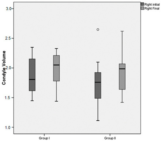 | Right Condyle Volume (cm3) | Group I (n = 15) | Group II (n = 14) | %95 CI | p | |