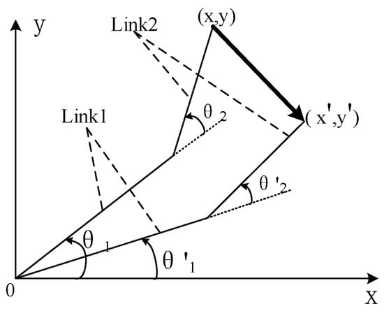 where (x, y) are the coordinates of the end effector within the rotation range of the manipulator. Based on the actual working range, the range of is [30°, 150°] and that of is [−120°, 120°]. The length of the two-link horizontal manipulator is 750 mm. The lengths of link1 and link2 are 400 and 350 mm, respectively.