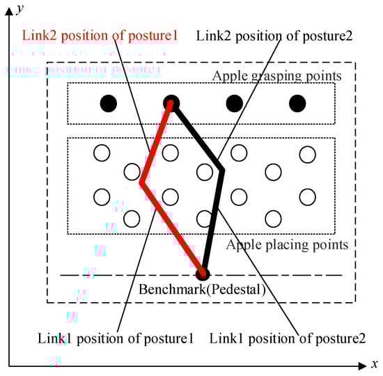 where and are the joint rotation angles of Links 1 and 2, respectively, and link1 and link2 are the lengths of Links 1 and 2. For the convenience of calculation, joint rotation angles and are positive when the arm rotates counterclockwise and are negative when the arm rotates clockwise. Every rotatory joint has two different postures when the end effector of the manipulator reaches any point within the rotation range because the manipulator is a horizontal rotating structure, as shown in Figure 4. The shape of the apple is approximately spherical, and it is approximately circular in all directions in the horizontal plane. The resulting change in end effector orientation does not affect the grasp of the apple when the manipulator is in different postures. Therefore, two values of and are found for the coordinates of any points in the rotation range, as shown in Equation (2).