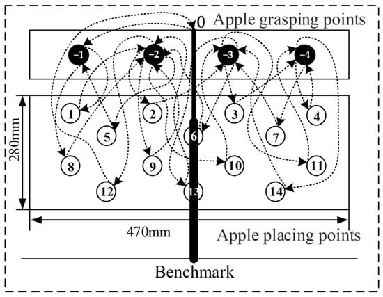 Before path optimization, grasping points with apples and placing points without apples are labeled in order. Apple grasping points are labeled with negative values from left to right (−1, −2, −3, −4, …, −m), and apple placing points are labeled with positive values from left to right and from top to bottom (1, 2, 3,…, n), as shown in Figure 6. The coordinates of each point within the rotation range are mapped to the coordinates in the visual detection system.