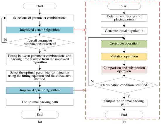 The packing path optimization algorithm is realized using an improved genetic algorithm fused with an optimal parameter selection algorithm. The improved genetic algorithm mainly includes the following steps: definition of chromosome generation rule, fitness function setting, crossover operation, mutation operation, comparison, and substitution operation. An optimal parameter selection algorithm is proposed to improve the optimization results of the genetic algorithm. The improved genetic algorithm fused with the optimal parameter selection algorithm is shown in Figure 7a, and the improved genetic algorithm is shown in Figure 7b. The parameter combination includes four parameters, namely, population size, crossover probability, mutation probability, and comparison substitution coefficient.