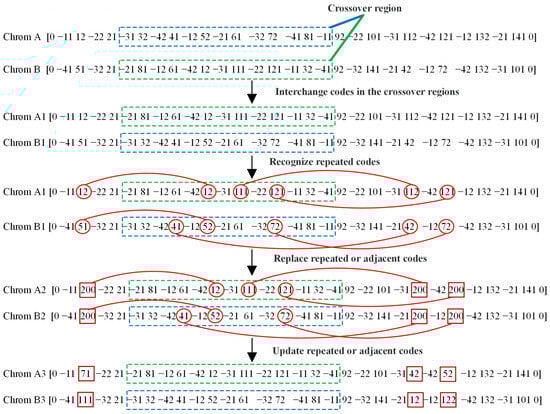 - Codes in crossover regions are interchanged. When two paternal chromosomes that need to be changed are named A and B, respectively, they are interchanged from the acr_nodeth code to the (acr_node + acr_len)th code, and the progeny chromosomes are A1 and B1.