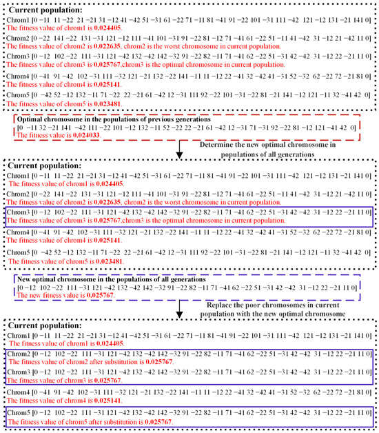 The population of chromosomes evolves. The process of the comparison and substitution operator is shown in Figure 10 when the population size is 5 and the substitution coefficient c is 0.4.