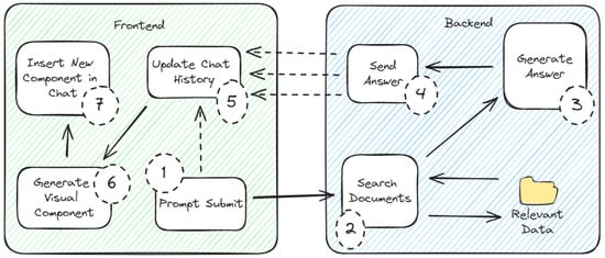 The aim of the frontend is to create the visual and interactive elements of the website application, namely, the chatbot interface that represents the user interface for the conversational agent. Therefore, next, the frontend architecture is implemented and a brief description of its processes is shown. Figure 5 illustrates the various components implemented and the flow between them, addressing the required integration with the backend also.