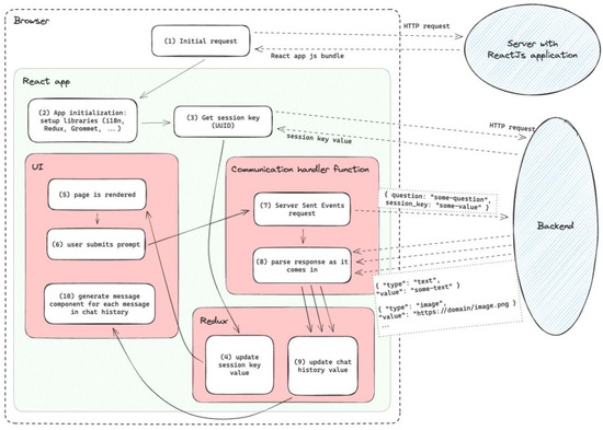 Before the application is functional, a request is made to the backend server to obtain a session key (Step 3), which serves as a Universally Unique IDentifier (UUID) for the user’s chat session within the context of the two applications (backend and frontend application). This obtained session key is stored in Redux [20] (Step 4), which is responsible for the global state management of the application, in order to identify which machine is requesting an answer when sent to the backend.