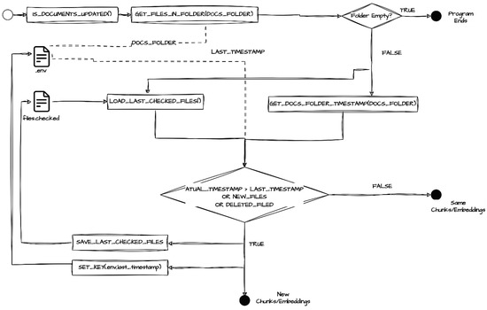 The construction of the documents knowledge database is the first step to allow a reliable font of information to be used by the developed solution. Therefore, initially, a function checks whether the documents in a specified directory are up to date. This function uses the docs_folder variable, which stores the directory path from the .env file. If the documents are not up to date, they are loaded, split into smaller chunks for processing, and then indexed in a vector database. In our case, we used the FAISS [8] vector database. If the documents are already up to date, the existing vector database is used. This step, as we can see in Figure 6, is crucial for effective document processing and subsequent information retrieval.